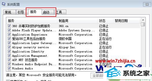 2、在打开的系统配置窗口中,切换到“服务”和“启动”标签页,把其中的不必要的启动项和服务全部打勾,然后点击右下角的“全部禁用”,确认之后,重新启动win10 64位旗舰版系统就可以了。