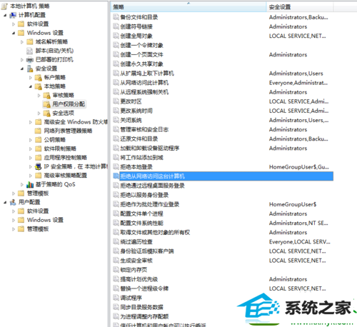 11:点击“windows设置”-“安全设置”-“本地策略”-“用户权限分配”。在右侧窗口找到“拒绝从网络访问这台计算机”,双击。