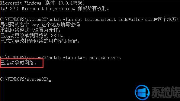 3、接着输入netsh wlan start hostednetwork命令按回车,当提示“已启动承载网络”即完成,