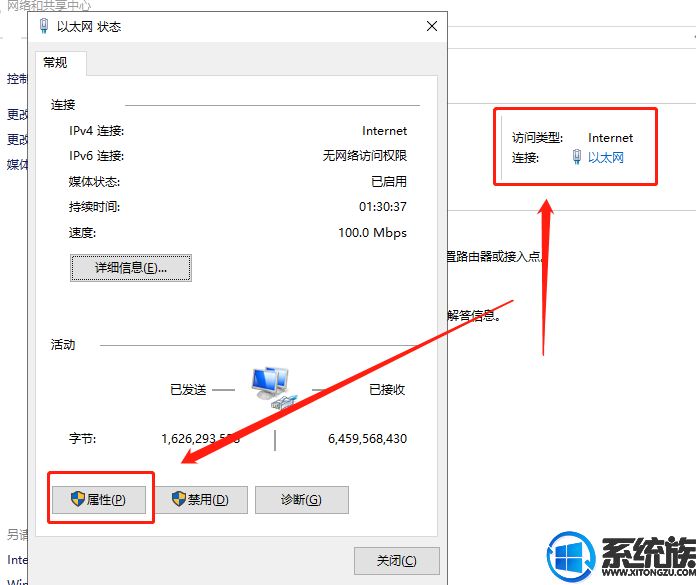 5、点击“以太网”,会弹出以太网状态界面,如下图2所示,点击图2上的“属性”选项;win7ip配置地址设置子网掩码操作配置办法