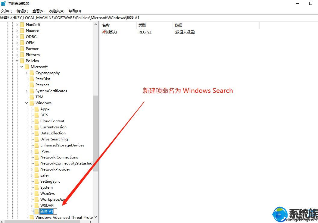 2、在注册表编辑器中,按照以下顺序展开“HKEY_LoCAL_MACHinE\soFTwARE\policies\Microsoft\win\”,选择“win”项,右键新建名为 win search 的项。