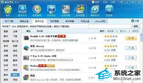 3、在打开金山卫士主界面,进入软件管理标签,打开软件打全,点击左侧界面标签,在选择解压的程序即可;