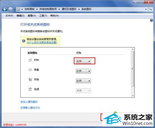 4、 点击“打开或关闭系统图标”后,打开“系统图标”界面,在这里我们可以设置时钟、音量、网络、电源等图标状态的显示,在这里我们可以看到时钟的状态的是“关闭”的,这也就是我们的状态栏不能显示时间的原因;