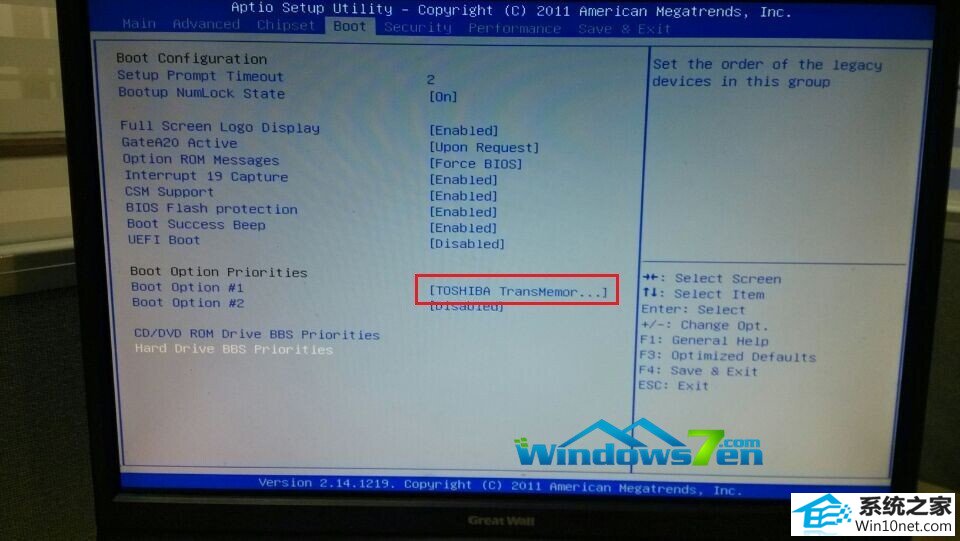 2.按下开机按钮,迅速按下键盘上dEL键或者是F12键(在电脑进入启动程序前),进入Bios设置界面,找到BooT栏目,将带有UsB字样的选项或者是代表U盘牌子的选项设为第一启动项,并按下F10保存并退出(具体按键请参考Bios界面上的提示内容)如图1所示: