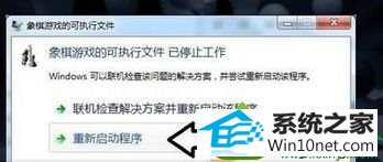 今天和大家分享一下win10系统打开象棋游戏提示“象棋游戏的可执行文件 已停止工作”问题的解决方法,在使用win10系统的过程中经常不知道如何去解决win10系统打开象棋游戏提示“象棋游戏的可执行文件 已停止工作”的问题,有什么好的办法去解决win10系统打开象棋游戏提示“象棋游戏的可执行文件 已停止工作”呢?小编教你只需要1、在弹出的错误提示框中点击“重新启动程序”; 2、保持联网状态,windows 会开始检查问题的解决方案;就可以了;下面就是我给大家分享关于win10系统打开象棋游戏提示“象棋游戏的可执行文件 已停止工作”的详细步骤::